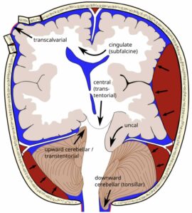 Hvorfor er forhøjet intrakranielt tryk et problem? Det er det selvfølgelig fordi det er en almindelig årsag til død ved meningitis, og det er det også, fordi det er forbundet med risiko for herniering. Her er en illustration fra wikipedia af de forskellige måder hjernen kan herniere på, hvis man har brug for at blive mindet om det