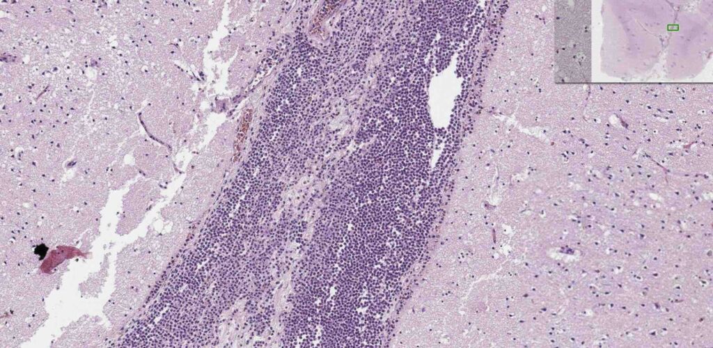 Kigger man på obducerede hjerner efter bakteriel meningitis, så finder man ødem, hydrocephalus, petekielle blødninger, nekrotiske læsioner i cortex og subcortikalt, tabte myelinfibre i den hvide substans og hippocampas apoptose. Post-mortem-studier efter pneumokokmeningitis har primært fundet bakterier i subarachnoidea og i vaskulaturet, hvilket taler for, at hjerneskaden ved meningitis primært er medieret af vaskulitis, vasospasmer, cerebral hypoperfusion, iskæmi og infarkt (van de Beek, 2016).