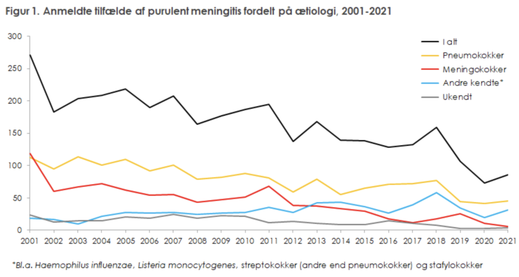 I 2001 var der 275 tilfælde af meningitis med meningokokmeningitis og pneumokokmeningitis som hovedårsager med hver godt 110 tilfælde. Incidensen er faldet drastisk siden da til omtrent 100 tilfælde pr. år i 2021. Husk covid-19 i 2020! Meningokokker er nærmest udryddet fra det mikrobiologiske billede.