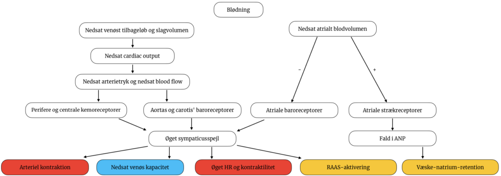 - Blødning sænker det venøse tilbageløb til hjertet, så der er mindre blod at pumpe ud, hvilket giver et fald i cardiac output. Man ihukommer, at middelarterietrykket er ligefremt proportionelt med cardiac output, så når det sidste falder, faldet det første med det. Et lavere systemisk blodtryk registreres af baroreceptorer i aorta og i carotiderne, hvilket iværksætter et adrenergt respons.