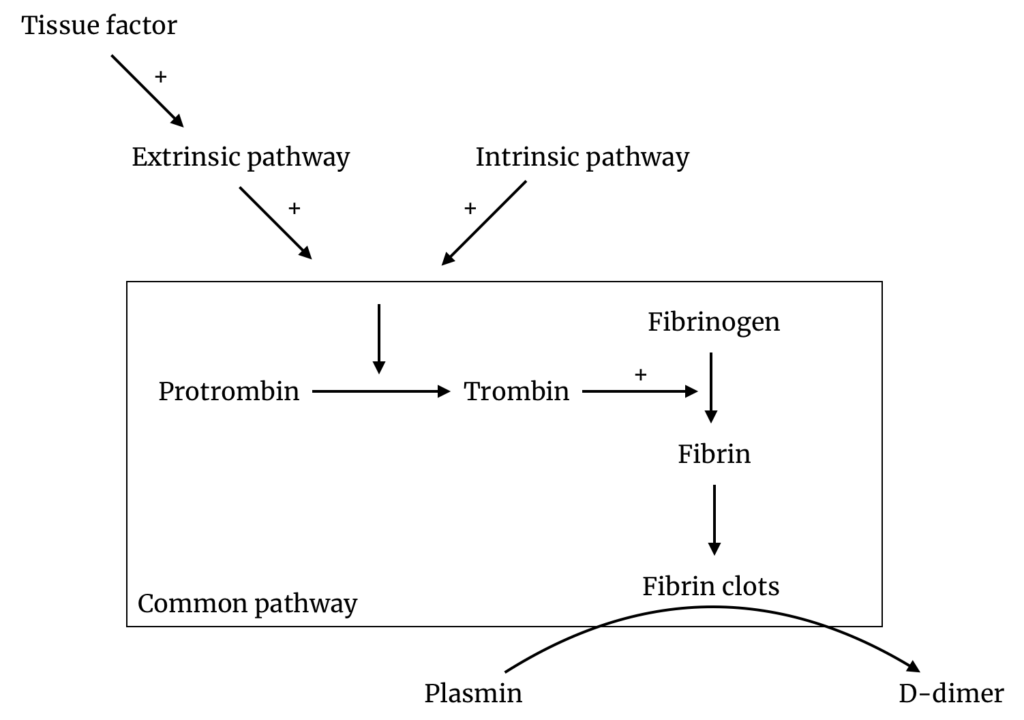 Koagulationskaskaden har en ekstern og en intern pathway, der aktiveres på to forskellige måder og som løber sammen i en fælles pathway, bedre kendt som the common pathway. Den eksterne pathway aktiveres af et protein, tissue factor, eller på dansk vævsfaktor, og gennem flere trin omdannes protrombin til trombin. Trombin kløver fibrinogen til fibrin, og fibrin krydsbinder og danner det proteinnet, der holder trombocytterne sammen.