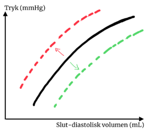De to stiplede kurver viser situationen med øget (rød kurve) og sænket inotropi (grøn kurve), det vil sige situationer, hvor hjertemuskulaturen pumper kraftigere, men ved samme fyldning og derfor er i stand til at levere mere henholdsvist mindre tryk.