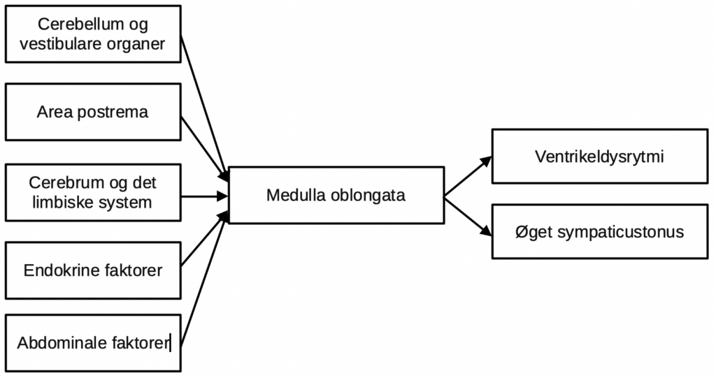 - Som angivet er kausalsammenhængen ikke helt klar. Kvalme er formentlig forudgået af dysrytmi i ventriklen.