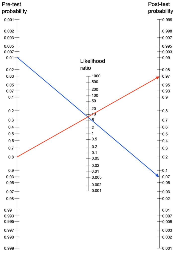 Grunden til at likelihood ratioer skulle være mere anvendelige beror i nogle argumenter på, at man kan få hjælp af et Fagan nomogram. Jeg har til gode at se en kliniker med et Fagan nomogram, men det skal ikke forhindre nogen i at dvæle lidt ved det. Så lo and behold, en udgave af Fagans nomogran, opkaldt efter forfatteren på en NEJM-artikel fra 1975 (der selvfølgelig er bag pay-wall).