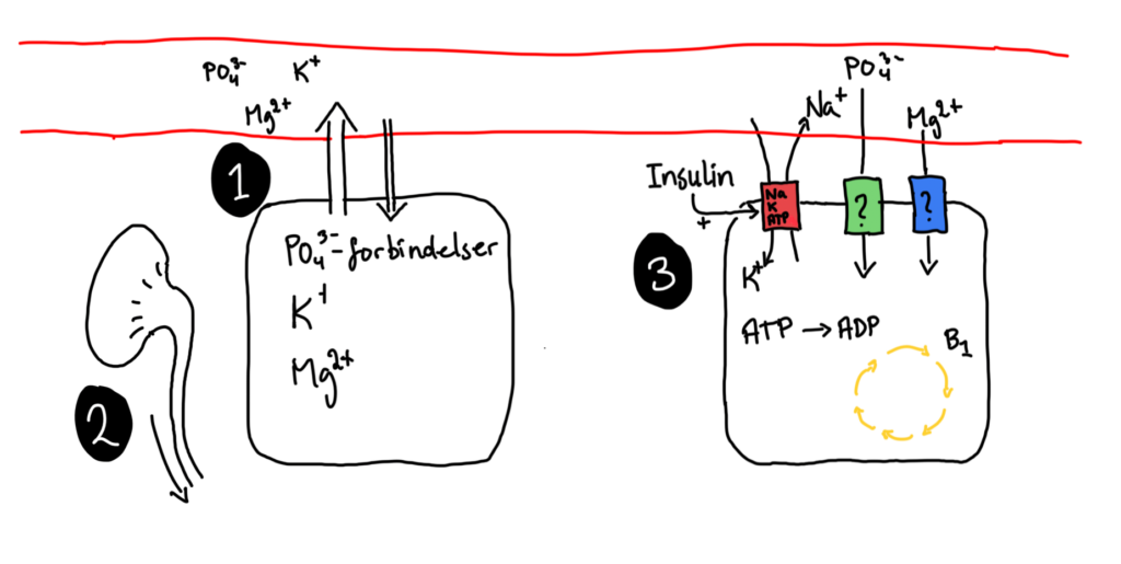 Insulinsekretion stimulerer det cellulære optag af glukose, fosfat (gennem en mekanisme, som man formentlig ikke kender til), kalium (NaKATPasen er insulinsensitiv) og magnesium (igen gennem en mekanisme, jeg ikke kender til) og giver derfor pludseligt et ekstracellulært fald, der kan måles som faldende plasmakoncentrationer.