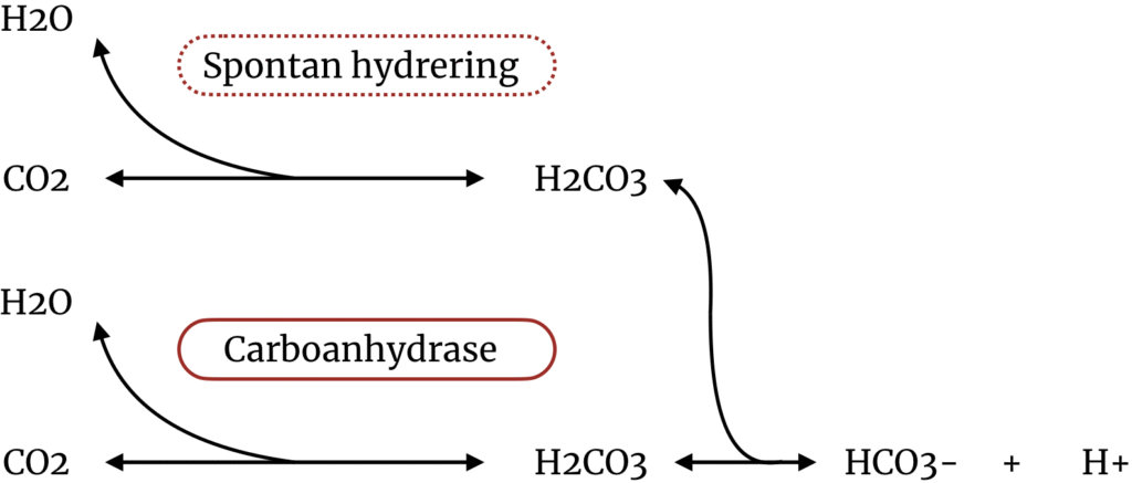 Helt centralt i transporten af CO2 i blodet er carboanhydrase. Givet den ufattelige interesse alle mulige andre enzymer i kroppen får, er det nok ikke helt forkert at kalde carboanhydrase en unsung hero of metabolism. Der er tale om en gruppe af isoforme enzymer, der alle katalyserer den samme proces som illustreret ved nedenstående figur: