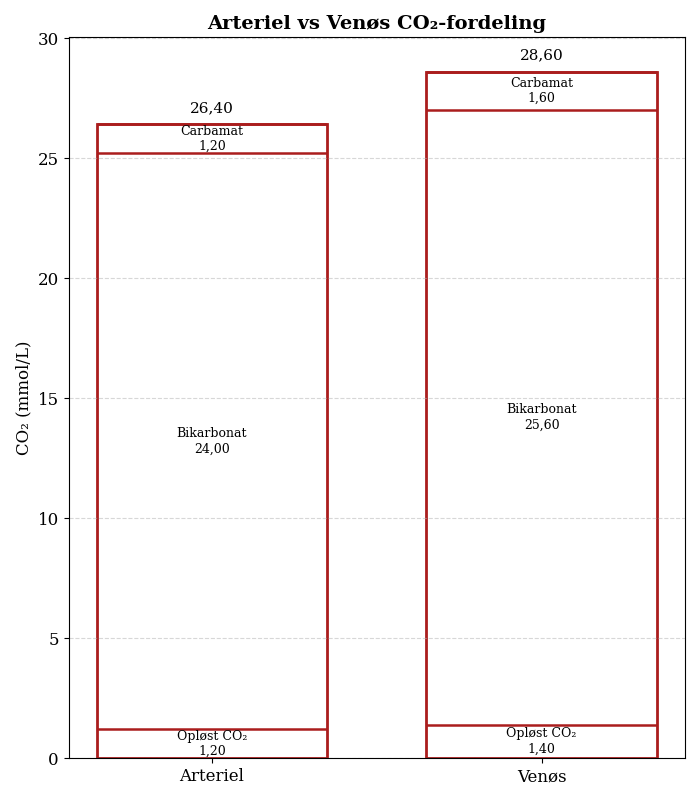 For den mere visuelt orienterede læser, er her en omsætning af tallene i ovenstående tabel til et fint søjlediagram, der viser de tre hovedfraktioner af CO2 i henholdsvist arterielt og venøst blod.